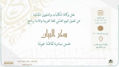 أعلنت الرئاسة العامة لشؤون المسجد الحرام والمسجد النبوي، وعبر وكالة المكتبات والشؤون الثقافية عن إقامة برنامج (سحر البيان) ضمن مبادرة ثقافتنا هويتنا والتي أطلقتها إدارة الشؤون الثقافية بمكتبة الحرم المكي الشريف تفعيلاً لليوم العالمي للغة العربية بمكتبة المسجد الحرام – باب الملك فهد وذلك يوم السبت الموافق 23/5/1444هـ – 17/12/2022م في تمام الساعة 6:10 مساءً.