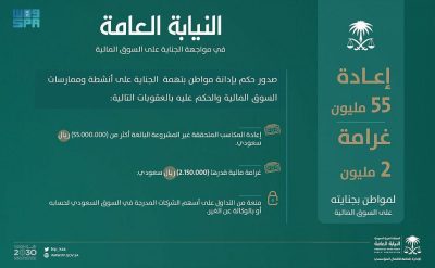 النيابة العامة : إلزام مواطن بإعادة (55) مليون ريال وتغريمه أكثر مليوني ريال لجنايته على أنشطة وممارسات السوق المالية