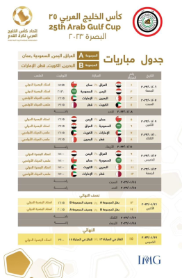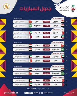 أصدرت لجنة المسابقات باتحاد كأس الخليج لكرة القدم، جدول مباريات بطولة كأس الخليج العربي في نسختها الـ25 والتي ستقام في البصرة بالعراق في الفترة من 6 إلى 19 يناير 2023 .