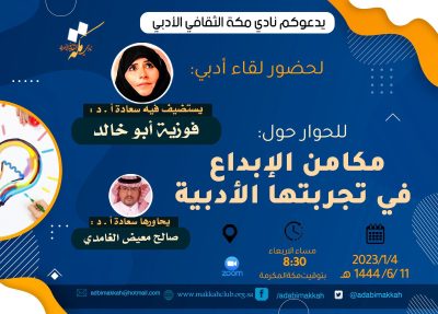 ينظم نادي مكة الثقافي الأدبي لقاء أدبي حواري مع أ. فوزية أبو خالد للحديث حول ” مكامن الإبداع في تجربتها الأدبية” ، فيما يدير الحوار سعادة أ. د. صالح معيض الغامدي ، وذلك مساء الأربعاء 1444/6/11 هـ في تمام الساعة 8:30 مساءاً عبر المنصة الافتراضية ( زوم ).
