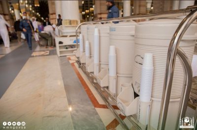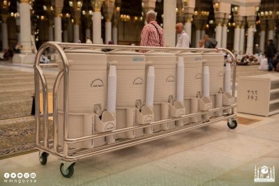 شرعت الرئاسة العامة لشؤون المسجد الحرام والمسجد النبوي وعبر وكالة شؤون المسجد النبوي في توفير وتأمين عربات متنقلة لحافظات ماء ” زمزم ” المبارك في المسجد النبوي، حيث تمتاز هذه العربات ، بسهولة نقلها داخل المسجد النبوي ، بالإضافة لتطبيقها لافضل واعلى معايير السلامة والاحتراز الوقائي لصون الماء المبارك.