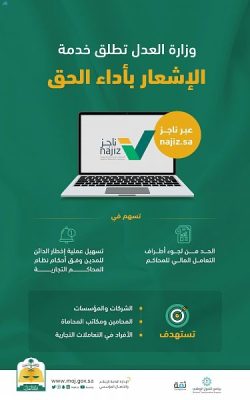 أطلقت وزارة العدل خدمة الإشعار بأداء الحق من خلال خدمات التبليغ العدلي في بوابة ناجز Najiz.sa والتي تضمن وتوثق إخطار الأطراف بالمبلغ الذي يجب استيفاؤه ليقوم بالسداد خلال مدة معلومة وأوضحت وزارة العدل أن خدمة الإشعار أداء الحق تتيح لطالب الخدمة إخطار الأطراف بالمبلغ الذي يجب استيفاؤه ليقوموا بالسداد ضمن المدة المحددة نظامياً وفي حالة عدم السداد يحق لطالب الخدمة رفع قضية في المحكمة التجارية للمطالبة بمستحقاته المالية مشيره إلى أن الخدمة تستهدف الشركات والمؤسسات والمحامين ومكاتب المحاماة إضافة إلى الأفراد في التعاملات التجارية بهدف الحد من لجوء أطراف التعامل المالي إلى المحاكم وتسهيل عملية الإخطار بين الأطراف وبينت الوزارة أنه يمكن الاستفادة من الخدمة من خلال الدخول إلى خدمات التبليغ العدلي في بوابة ناجز وتحديد وسيلة الإرسال والدفع حيث تم تطوير وتشغيل الخدمة من قبل شركة ثقة .