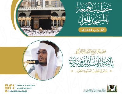 اعلنت الرئاسة العامة لشؤون المسجد الحرام والمسجد النبوي ، وعبر وكالة شؤون الأئمة والمؤذنين ممثلة في إدارة شؤون الأئمة ، أن خطيب وامام الجمعة الثانية والمصادفة 12 رجب 1444هـ بالمسجد الحرام، الدكتور ياسر راشد الدوسري .