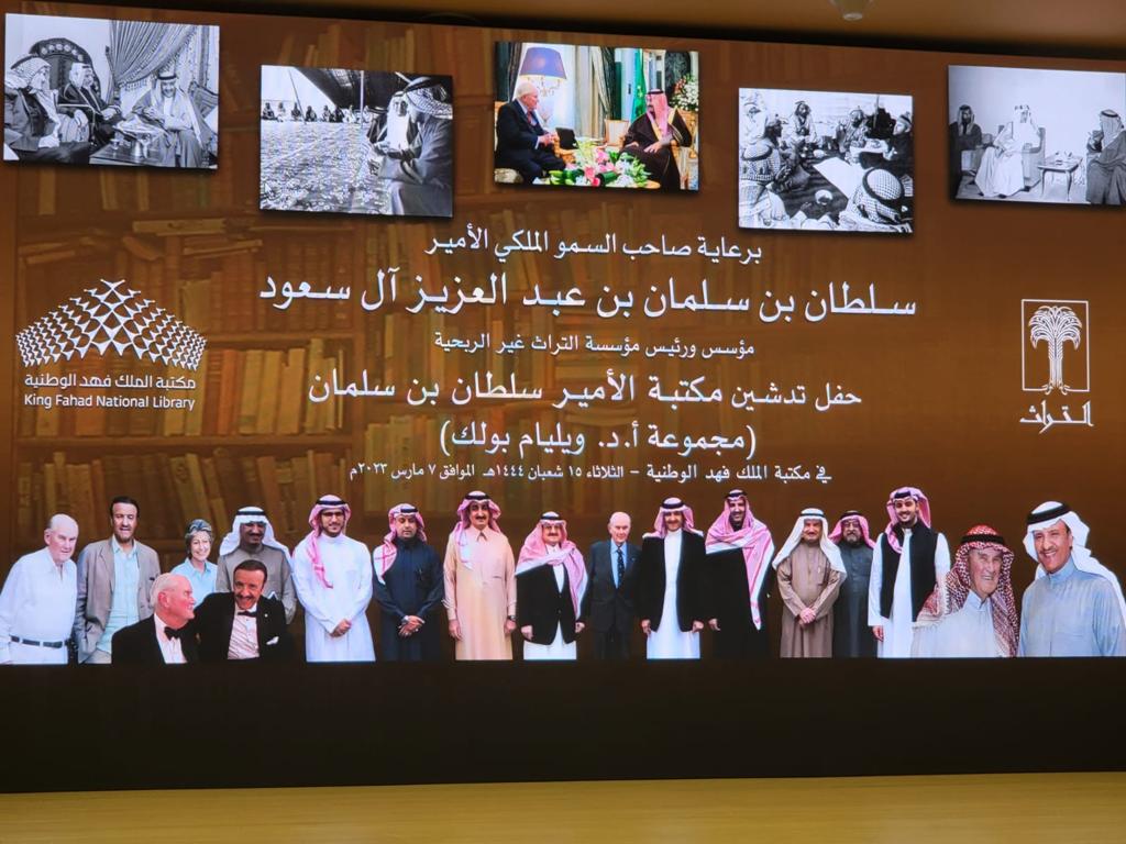 دشن صاحب السمو الملكي الأمير سلطان بن سلمان بن عبدالعزيز مستشار خادم الحرمين الشريفين مؤسس ورئيس مؤسسة التراث غير الربحية في مكتبة الملك فهد الوطنية الليلة مجموعة كتب الدكتور ويليام رو بولك بحضور صاحب السمو الأمير خالد بن فهد بن عبدالرحمن وصاحب السمو الملكي الأمير جلوي بن عبدالعزيز بن مساعد أمير منطقة نجران والأمين العام المكلف لمكتبة الملك فهد الوطنية الدكتور عبدالرحمن بن ناصر العاصم وعدد من المسئولين والمهتمين بقطاع الثقافة والتراث والتأليف.