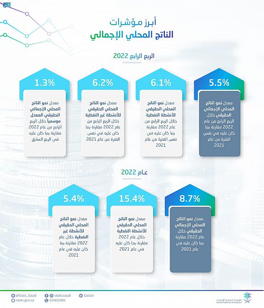 حقق الاقتصاد السعودي خلال عام 2022م نموًا في الناتج المحلي الإجمالي بلغ 8.7% إذ يُعد هذا المعدل أعلى معدلات النمو بين دول مجموعة العشرين خلال هذا العام رغم الظروف والتحديات الاقتصادية المُعقدة التي تعيشها دول العالم ، متجاوزًا بذلك توقعات المنظمات الدولية التي بلغت في أقصى تقديراتها 8.3% فيما يُعد معدل النمو الحالي أعلى المعدلات السنوية في العقد الأخير وذلك بحسب ما أصدرته الهيئة العامة للإحصاء اليوم وفقًا لتقرير الناتج المحلي الإجمالي ومؤشرات الحسابات القومية للربع الرابع من عام 2022م وفي ذات السياق أعلنت الهيئة العامة للإحصاء أن الناتج المحلي الإجمالي بلغ بالأسعار الجارية أكثر من تريليون دولار أمريكي في عام 2022م وهي المرة الأولى التي يحقق فيها الناتج المحلي الإجمالي في المملكة العربية السعودية هذه القيمة الإجمالية مدعومًا بتنوع الأنشطة التي أسهمت في تحقيقه إذ حققت جميع الأنشطة الاقتصادية معدلات نمو إيجابية خلال عام 2022م حيث بلغت نسبة مساهمة أنشطة الزيت الخام والغاز الطبيعي 32.7% تليها أنشطة الخدمات الحكومية بنسبة 14.2% تليها أنشطة الصناعات التحويلية ماعدا تكرير الزيت بنسبة 8.6% ثم أنشطة تجارة الجملة والتجزئة والمطاعم والفنادق بنسبة مساهمة قدرها 8.2% ، يذكر أن السياسات التي اتخذتها المملكة لدعم الاقتصاد الوطني أسهمت في تنوع مصادره وتوفير البيئة المناسبة لتحقيق النمو الذي شهده الناتج المحلي الإجمالي بكافة مكوناته خلال العام الماضي حيث أسهمت الإصلاحات الاقتصادية والمالية وكذلك برامج الرؤية ومبادراتها ومشاريعها الكبرى إضافةً إلى إتاحة المزيد من الفرص الاستثمارية أمام الصناديق التنموية والقطاع الخاص وكشفت نتائج التقرير وجود نمو إيجابي في الأنشطة غير النفطية بمقدار 5.4% خلال عام 2022م وبلغت أنشطة النقل والتخزين والاتصالات أعلى معدلات النمو في الأنشطة غير النفطية بمقدار 9.1% تليها أنشطة الصناعات التحويلية ما عدا تكرير الزيت بنسبة 7.7% وفي إطار الربع الرابع من عام 2022م كشف التقرير أن الناتج المحلي الإجمالي الحقيقي ارتفع بنسبة 5.5% مقارنة بالربع المماثل من العام السابق حيث حققت الأنشطة غير النفطية ارتفاعاً بنسبة 6.2% مقارنةً بما كان عليه في نفس الفترة من العام السابق كما أظهر التقرير نمو الناتج المحلي الحقيقي للأنشطة النفطية خلال الربع الرابع 2022م بنسبة 6.1% مقارنةً بما كان عليه في نفس الفترة من العام السابق 2021م فيما حقق الناتج المحلي الإجمالي الحقيقي المعدَّل موسمياً خلال الربع الرابع من عام 2022م ارتفاعاً بلغت نسبته 1.3% مقارنة بما كان عليه في الربع الثالث 2022م وتعد الهيئة العامة للإحصاء المرجع الإحصائي الرسمي والوحيد للبيانات والمعلومات الإحصائية في المملكة وتقوم بتنفيذ الأعمال الإحصائية كافةً والإشراف الفني على القطاع الإحصائي وتصميم وتنفيذ المسوح الميدانية وإجراء الدراسات والبحوث الإحصائية وتحليل البيانات والمعلومات وجميع أعمال توثيق وحفظ المعلومات والبيانات الإحصائية التي تُغطي جميع جوانب الحياة في المملكة مِنْ مصادرها المُتعدِّدةِ وتدوينها وتبويبها وتحليلها واستخراج مؤشراتها الإحصائية .