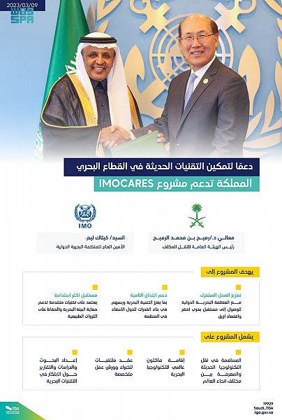 واس – وقع معالي رئيس الهيئة العامة للنقل المكلف الدكتور رميح بن محمد الرميح مع الأمين العام للمنظمة البحرية الدولية السيد كيتاك لم، في لندن عقدًا لدعم مشروع IMOCares ، الهادف إلى دعم الجهود الدولية لتمكين التقنيات الحديثة في القطاع البحري، ودعم تطوير التكنولوجيا في العالم.