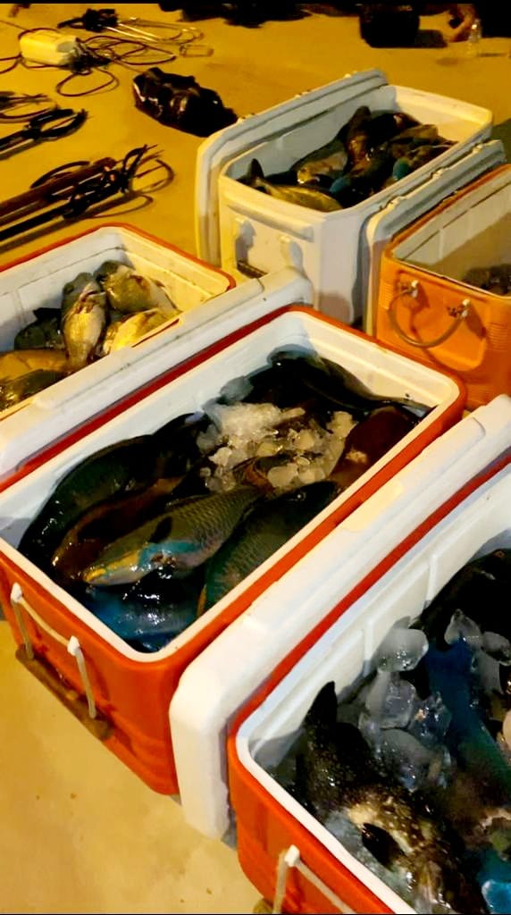 وفي التفاصيل اوضح مدير عام فرع وزارة البيئة والمياه والزراعة بمنطقة مكة المكرمة المهندس ماجد بن عبدالله الخليف انه تم ضبط عدد من المخالفين لنظام الصيد البحري بمركز الكدوف ” جنوب المحافظة ب 80 كيلو متر” ، بحوزتهم ” بنادق صيد ” محظوره ، حيث تم مصادرة تلك الأدوات المخالفة ، بالإضافة الى مصادرة ” المصيد” أكثر من 226 كيلوجرام من الأسماك .