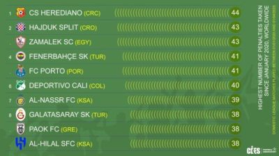 وجاء فريق النصر في المركز الخامس على مستوى أندية دوريات العالم حصولاً على ركلات الجزاء دورياً، بحصوله على 39 ركلة جزاء منذ يناير 2020 حتى الآن، بينما حل الهلال بعده في المركز السادس مباشرة بحصوله على 38 ركلة جزاء خلال الفترة نفسها.