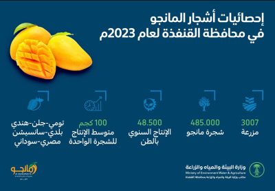 من جهته اوضح مدير مكتب وزارة البيئة والمياه والزراعة بمحافظة القنفذة المهندس حسن بن ابراهيم المعيدي عن عدد مزارع المانجو بمحافظة القنفذة بانها اكثر من 3007 مزرعة ويتجاوز الانتاج السنوي لها 45 ألف طن سنويًّا، مشيرًا أنه ابتداءا من شهر مايو يبدأ مزارعو محافظة القنفذة بحصد محصولهم من المانجو، ويستمر حصاد المحصول لأكثر من ثلاثة شهور بالمحافظة.