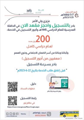 استعداداً لبداية العام الدراسي الجديد 1445هـ ؛ اطلع المدير العام للتعليم بمنطقة مكة المكرمة الأستاذ الدكتور أحمد بن محمد الزائدي اليوم على خدمة النقل المدرسي ؛ واستعدادات شركة تطوير لخدمات النقل ( رافد ) للعام الدراسي الجديد 1445هـ والحملة التوعوية للتعريف بالنقل المدرسي قبل إغلاق التسجيل بتاريخ 4 ذو الحجة 1444هـ