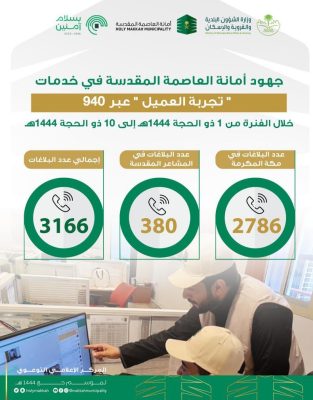 وبلغ عدد البلاغات في مكة المكرمة 2786 بلاغ، فيما بلغ عدد البلاغات في المشاعر المقدسة 380 بلاغ، وجرى التفاعل بشكل فوري مع البلاغات وإزالة أي معوقات على وجه السرعة.
