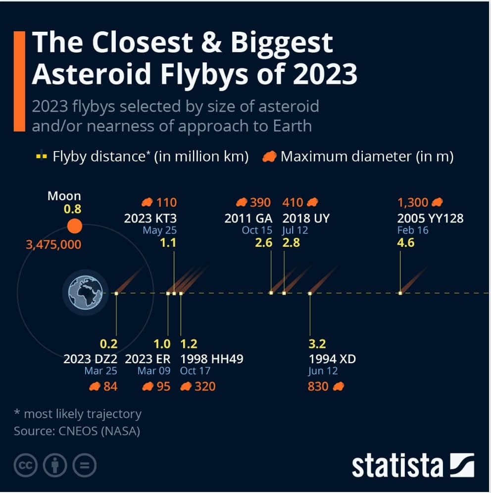 ووفقا لمركز ناسا لدراسات الأجسام القريبة من الأرض، فقد مر عدد من الكويكبات بالفعل بالقرب من الأرض هذا العام. أشهرها الكويكب المسمى 2005 – 128، حيث حلق بالقرب من الأرض في 16 فبراير الماضي، واقترب الى حد 1000 متر (0.6 ميل).