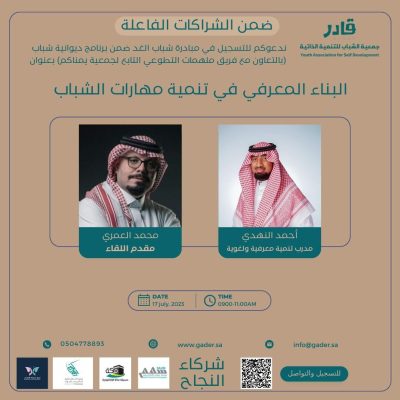 *الجدير بالذكر* أن هذه المبادرة ستنطلق عبر *منصة الفعاليات الافتراضية* التي دشنتها مؤخراً جمعية قادر لتكون منصة إلكترونية على مدار الساعة، حيث تدعو الجمعيتان الشباب للتسجيل في مبادرة شباب الغد بداية من اللقاء الأول الذي ينطلق يوم غد الاثنين ١٧ يوليو ٢٠٢٣ م بعنوان ( البناء المعرفي في تنمية مهارات الشباب) للمدرب أحمد النهدي والذي عرف بتنمية معرفية ولغوية.