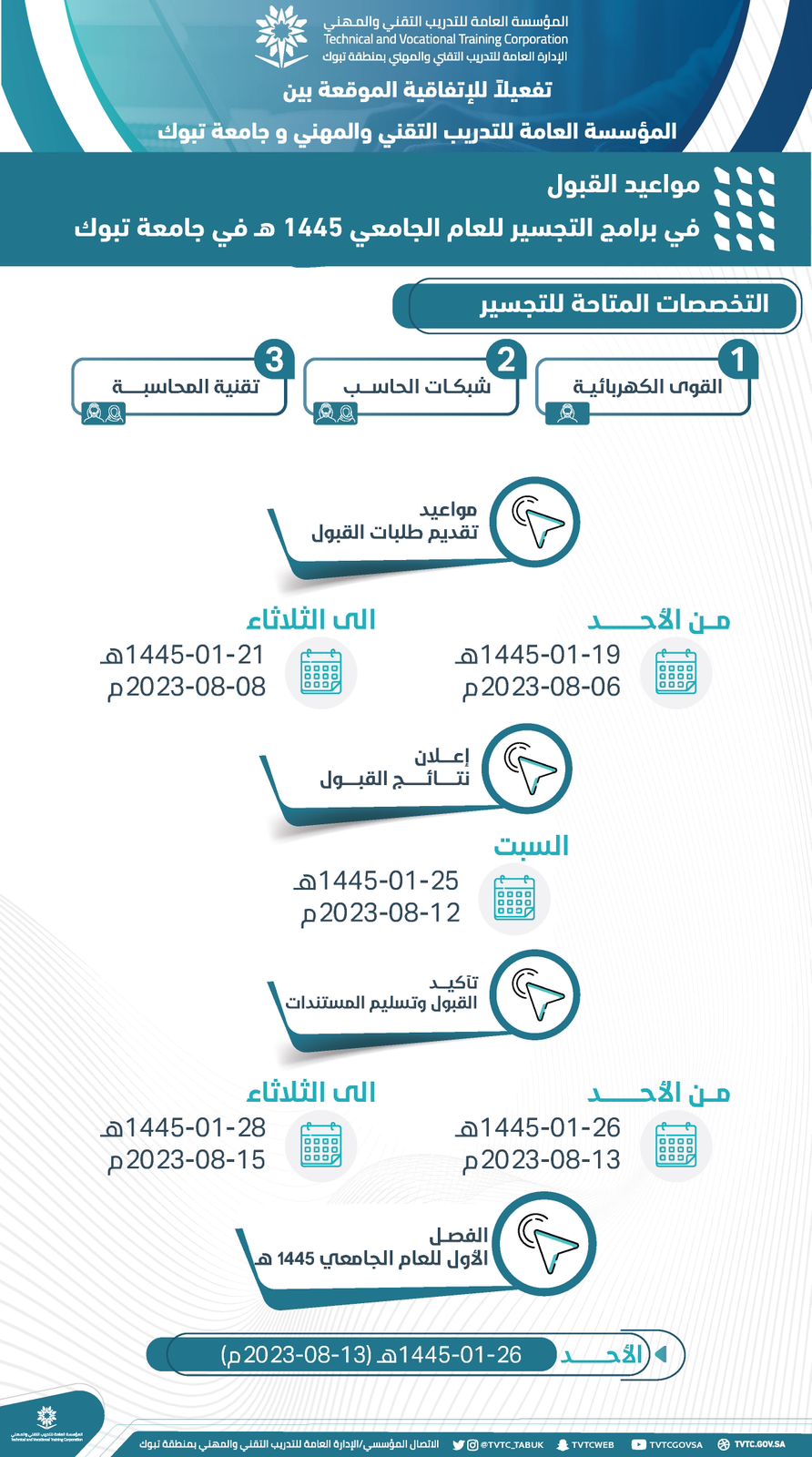 سعود الجهني- في إطار تفعيل الإدارة العامة للتدريب التقني والمهني بمنطقة تبوك للإتفاقية الموقعة،بين المؤسسة العامة للتدريب التقني والمهني وجامعة تبوك، تم فتح باب القبول والتسجيل في 3 تخصصات لـ 3 أقسام مختلفة،لخريجي وخريجات درجة الدبلوم للكليات التقنية لعام 1445 هـ بالجامعة.