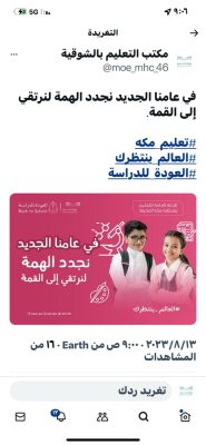 بدأت الإدارة العامة للتعليم بمنطقة مكة المكرمة – ممثلة إدارة الإعلام والاتصال اليوم الاحد 1445/1/26 في تنفيذ خطتها الإعلامية المتزامنة مع الخطة الإعلامية بوزارة التعليم لتنفيذ الحملة الإعلامية لبداية العام الدراسي 1445هـ وعودة الطلاب والطالبات ومنسوبي التعليم العام إلى مدارسهم والتي جاءت تحت عنوان ” العالم ينتظرك” وذلك سعياً لنشر ثقافة الاستعداد لبداية جادة ومميزة للعام الدراسي وتستهدف الحملة 1420مدرسة بها 397900 طالب وطالبة و 27147 معلم ومعلمة ، وتعمل على بث روح الحماس والدافعية في نفوس الطلبة وأولياء الأمور وأفراد المجتمع ؛ وتعزيز التصورات الإيجابية عن برامج ومشاريع الوزارة، ومبادراتها التطويرية لتسهيل تطبيقها ودعمها في تحقيق مستهدفاتها وتغطية ورصد البرامج والاستعدادات والتجهيزات التي نفذتها الإدارة العامة للتعليم بمنطقة مكة لانطلاقة العام الدراسي ؛ حيث تمثلت الحملة في صناعة العديد من الرسائل التربوية والإعلامية ونشرها في حسابات الإدارة والمكاتب والمدارس في مواقع التواصل الاجتماعي والصحف ووكالات الأنباء والقنوات التلفزيونية ؛ حيث تستهدف الحملة الكادر التعليمي والإداري والطلبة والأسر وأولياء الأمور وأفراد المجتمع .