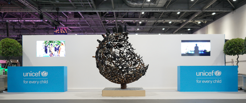 تعرض منظمة يونيسيف والفورمولا إي منحوتة فريدة للبيع في المزاد، صنعت من أجزاء سيارات الفورمولا إي التي تعرضت للتعطل أو الأضرار الجسيمة أثناء السباقات، وذلك بهدف التوعية بأثر التغير المناخي على اليافعين.