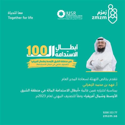 تم اختيار مدير عام جمعية زمزم الصحية فهد بن محمد الزهراني ضمن قائمة “أبطال الاستدامة المائة في منطقة الشرق الأوسط وشمال أفريقيا لعام 2023” التي يعلنها الاتحاد الدولي للمسؤولية المجتمعية وذلك استنادًا إلى تصنيفه العالمي المعني بالاستدامة.