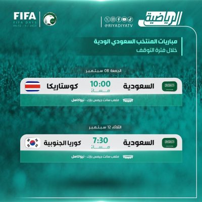 كما سيواجه المنتخب السعودي منتخب كوريا الجنوبية يوم الثلاثاء 12 سبتمبر الساعة 7:30 مساء، في ملعب سانت جيمس بارك – نيوكاسل.
