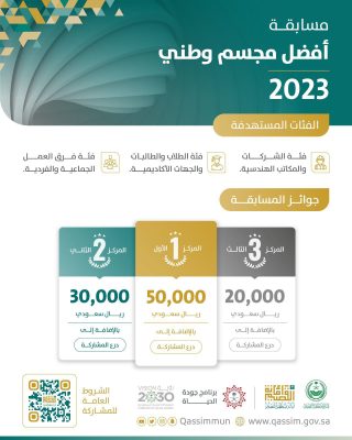 أطلقت أمانة القصيم مسابقة افضل تصميم مجسم وطني بمدينة بريدة والتي تركز علــى الرقي بالمشهد الحضري للمدينة والمحافظة علـى الثقافة والهوية العمرانية وذلك لتحقيق مستهدفات برنامج جودة الحياة وبجوائز تصل إلى 100 ألف ريال