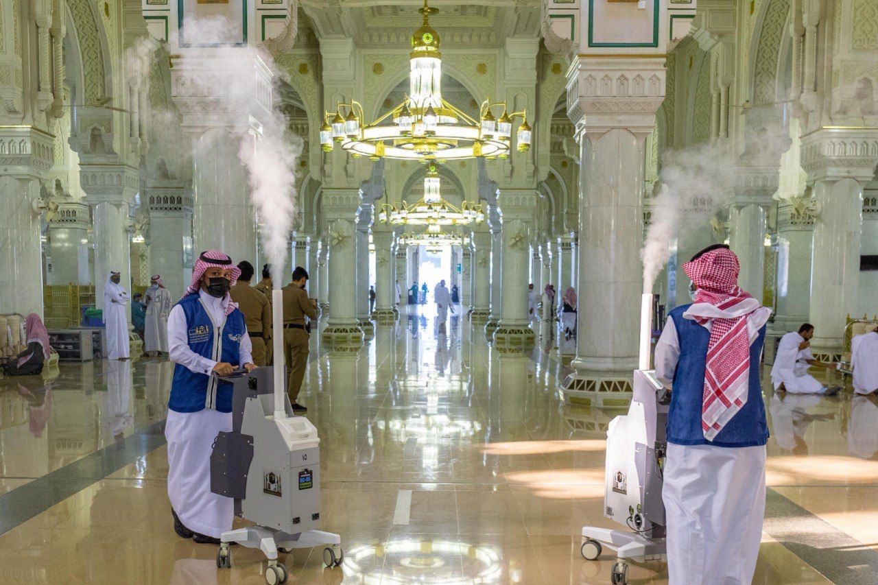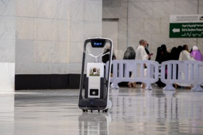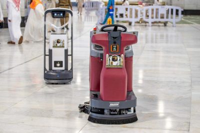 حيث تم توفير العديد من الروبوتات الذكية التي تقوم على خدمة المصلين والمعتمرين بالمسجد الحرام منها “روبوت التعقيم” والذي يعمل لتعقيم جنبات المسجد الحرام، بنظام تحكم آلي مبرمج على خريطة مسبقة، وعلى (6) مستويات مما يحسن سلامة الجو الصحي البيئي وتحليل متطلبات التعقيم بذكاء، وفقاً لسيناريوهات الاستخدام، ومسار التعقيم، والمدة المخططة بشكل مستقل لتغطية كاملة للفضاء البيئي، ويعمل الروبوت (5-8) ساعات من دون أي تدخل بشري، ويسع الجهاز (23.8) لتر، يستهلك منها لترين كل ساعة تقريباً، للقضاء على ‏البكتيريا في مساحة (600) متر مربع كل جولة.