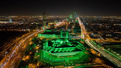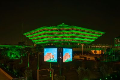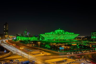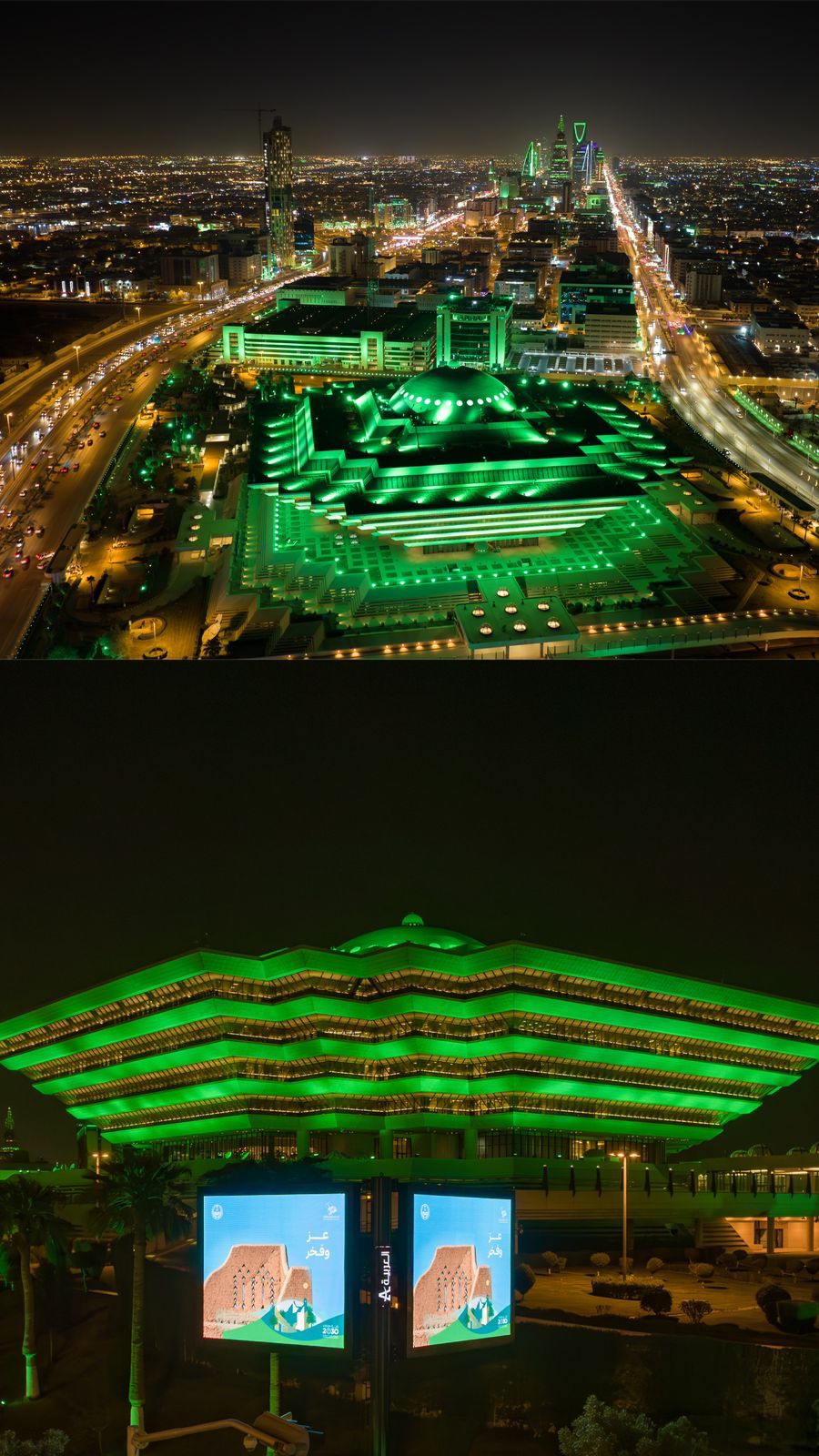 ويعد المبنى من أبرز معالم العاصمة الرياض لما يتميز به من تصميم هندسي جذاب ومميز، ازداد تألقاً بعد اكتسائه اللون الأخضر.