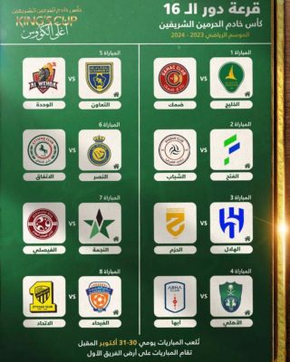 فيصل الشيخي _ الرياض | أسدل الستار اليوم الخميس، عن نتائج قرعة دور الـ16 من منافسات بطولة كأس خادم الحرمين الشريفين؛ بنظامه الجديد، بحضور ممثلي الأندية المتأهلة. وجرت مراسم القرعة دون حضور إعلامي كما جرت العادة سابقا، وتم الإكتفاء بآراء محللي القناة الناقلة الذين سيشاركون في تحليل المباريات الأخيرة من دور الـ32. ، وفيما يلي نتائج القرعة المعلن عنها: