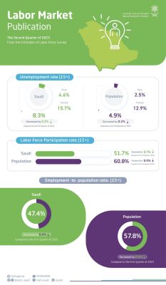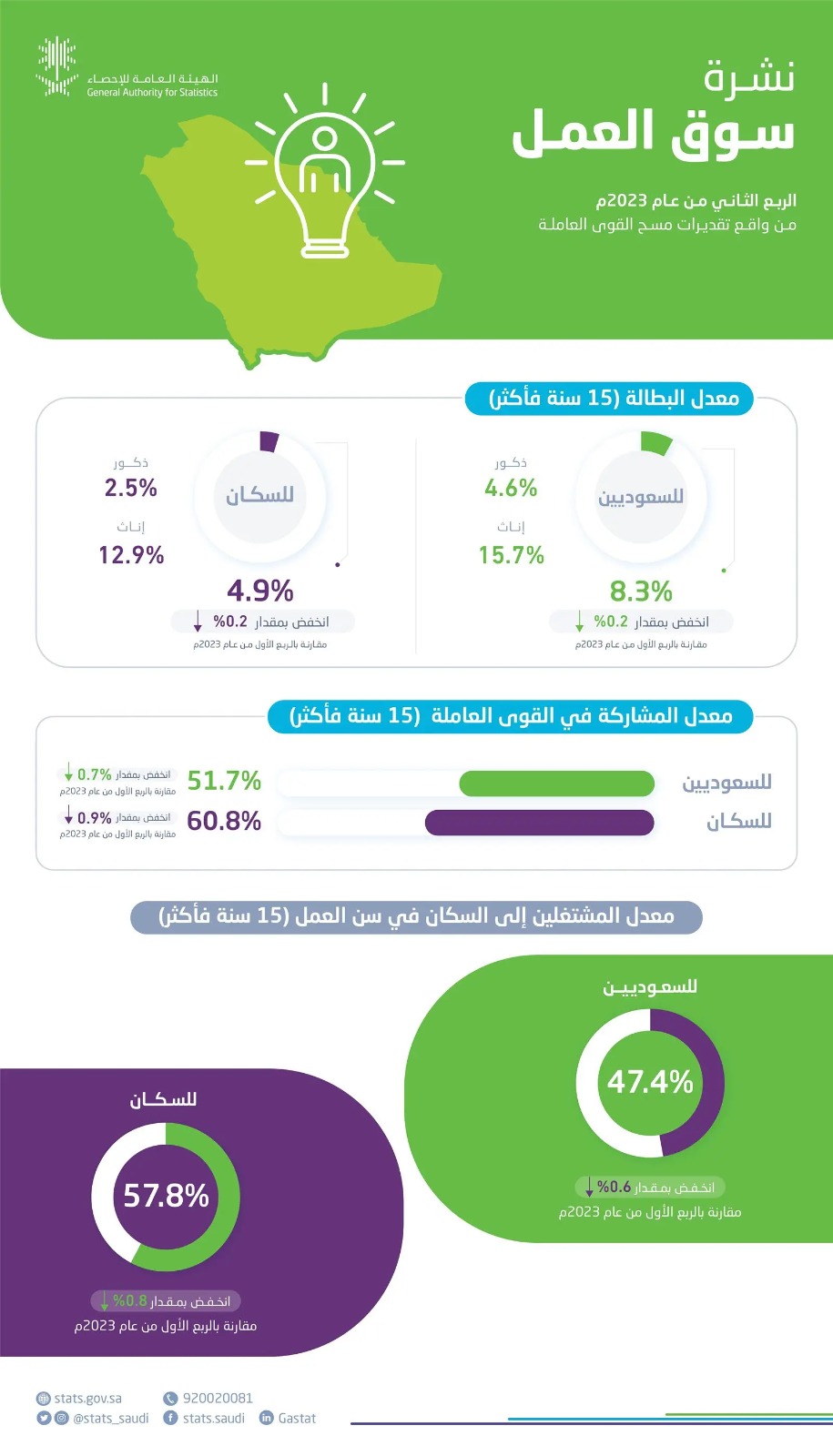 أصدرت الهيئة العامة للإحصاء (GASTAT) اليوم عبر موقعها الرسمي على شبكة الإنترنت www.stats.gov.sa نشرة سوق العمل للربع الثاني من عام 2023م ووفقًا لنتائج هذه النشرة فقد انخفض معدل البطالة الإجمالي (للسعوديين وغير السعوديين) إلى (4.9%) مقارنةً مع الربع الأول من عام 2023م كما انخفض معدل البطالة لإجمالي السعوديين حيث بلغ (8.3%) للربع الثاني من عام 2023م مقارنةً بـ (8.5%) في الربع الأول من نفس العام وانخفض كذلك معدل البطالة للسعوديات للربع الثاني من عام 2023م حيث بلغ(15.7%) مقارنةً بـ (16.1%) في الربع السابق هذا وقد استقر معدل البطالة للسعوديين الذكور خلال الربع الثاني من عام 2023م عند (4.6%) وأظهرت مؤشرات القوى العاملة خلال الربع الثاني من عام 2023م انخفاض معدل المشاركة في القوى العاملة الإجمالي (للسعوديين وغير السعوديين) حيث بلغ(60.8%) مقارنة بـالربع الأول من عام 2023م كما انخفض معدَّل المشاركة في القوى العاملة لإجمالي السعوديين للربع الثاني من عام 2023م حيث بلغ (51.7%) مقارنةً بـالربع السابق وأفادت نتائج نشرة سوق العمل للربع الثاني من عام 2023م انخفاض معدل المشاركة في القوى العاملة للسعوديات للربع الثاني من عام 2023م حيث بلغ (35.3%) مقارنةً بـالربع السابق وانخفاض معدل المشاركة في القوى العاملة للسعوديين الذكور للربع الثاني من عام 2023م حيث بلغ (67.5%) مقارنةً بـ (68.3%) في الربع السابق ، يُشار إلى أن نشرة سوق العمل -كما أفادت الهيئة العامة للإحصاء- تعتمد في نتائجها على مسح أُسري تُجْريه الهيئة يندرج تحت تصنيف (الإحصاءات الاجتماعية) ويتم فيه جمع المعلومات من خلال عينة من الأسر ممثِّلة لسكان مختلف المناطق الإدارية في المملكة العربية السعودية واستيفاء استمارة إلكترونية تحتوي على عددٍ من الأسئلة ومن خلال هذا المسح يتم توفير تقديرات ومؤشرات تتعلق بقوة العمل للسكان في سن العمل للفئة العمرية (15سنة فأكثر) المستقرين في المملكة العربية السعودية، وتقدير السكان (داخل قوة العمل وخارجها) وكذلك حساب أهم مؤشرات سوق العمل كمعدل البطالة ومعدل المشاركة في القوى العاملة وغيرها .