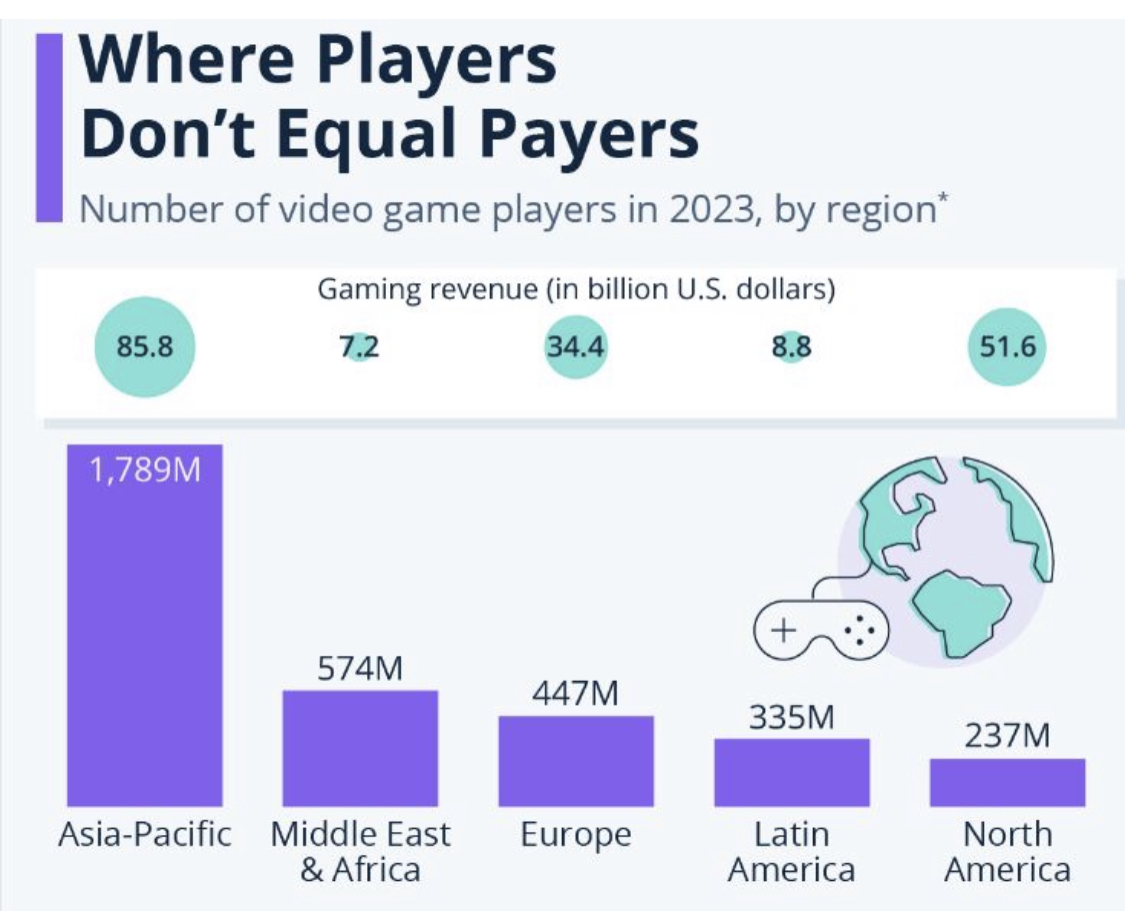 نحو 3.4 مليار شخص حول العالم لعبوا لعبة فيديو واحدة على الأقل خلال الأشهر الستة الماضية، وفقًا لأحدث تقرير من سوق الألعاب العالمية Newzoo. والمناطق التي تضم أكبر عدد من اللاعبين ليست بالضرورة تلك التي تحقق أكبر قدر من الإيرادات.