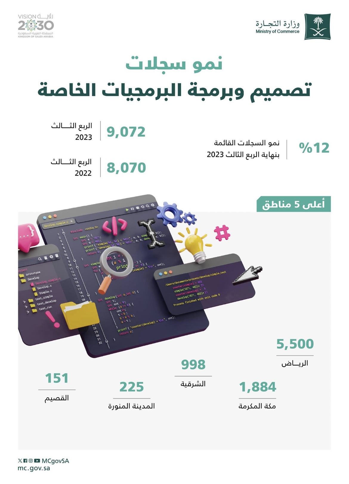 كشفت وزارة التجارة في نشرتها الربعية لقطاع الأعمال في الربع الثالث 2023 عن نمو 12% في السجلات التجارية القائمة لنشاط تصميم وبرمجة البرمجيات الخاصة بنهاية الربع الثالث 2023 وتضمنت النشرة تفصيلاً للسجلات التجارية لنشاط تصميم وبرمجة البرمجيات الخاصة حيث بلغت 9,072 سجلاً تجارياً بنهاية الربع الثالث 2023 مقارنة مع 8,070 سجلاً تجارياً بنهاية الربع المماثل من العام 2022 وتصدرت منطقة الرياض أعلى 5 مناطق في السجلات التجارية القائمة لنشاط تصميم وبرمجة البرمجيات الخاصة بواقع 5,500 سجل تجاري تلتها منطقة مكة المكرمة بواقع 1,884 سجلاً تجارياً ثم المنطقة الشرقية 998 سجلاً تجارياً ومنطقة المدينة المنورة بواقع 225 سجلاً تجارياً ثم منطقة القصيم بواقع 151 سجلاً تجارياً .