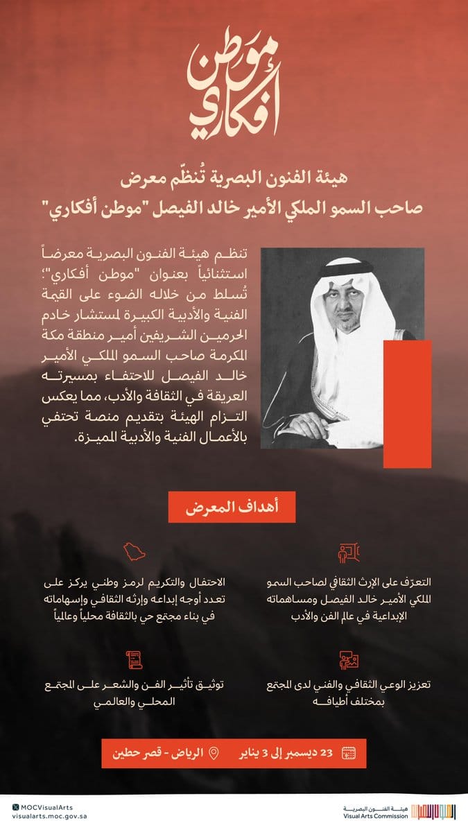 ويعكس معرض “موطن أفكاري” التزام الهيئة بتقديم منصةٍ تحتفي بالأعمال الفنية والأدبية للأمير خالد الفيصل.