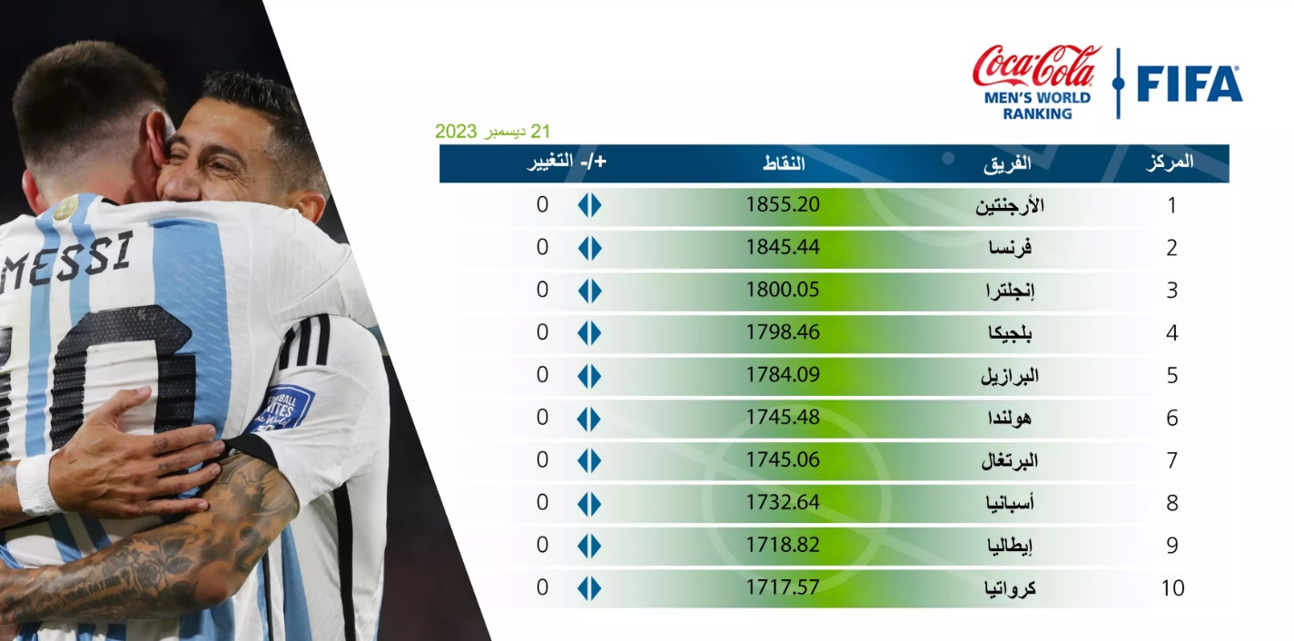 فبعد مرور عام واحد على تتويجها بكأس العالم FIFA قطر ٢٠٢٢، تمكنت الأرجنتين (1) من إنهاء السنة على قمة الهرم الدولي، متبوعة بكل من فرنسا (2) وإنجلترا (3)، علماً أن القائمة لم تشهد أي تغيير مهم على مستوى المراتب الثلاث عشرة الأولى.