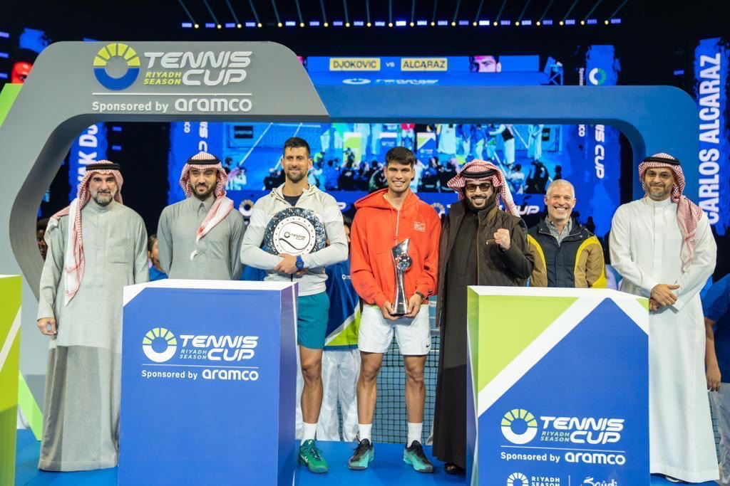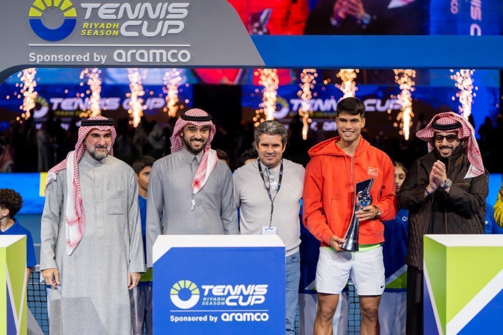 الرياض- توج صاحب السمو الملكي الأمير عبدالعزيز بن تركي بن فيصل بن عبدالعزيز وزير الرياضة ورئيس اللجنة الأولمبية والبارالمبية السعودية، ومعالي المستشار تركي بن عبدالمحسن آل الشيخ، رئيس مجلس إدارة الهيئة العامة للترفيه (GeA)، لاعب التنس الأسباني كارلوس ألكاراز بكأس موسم الرياض للتنس بعد فوزه -اليوم الأربعاء- على نظريه الصربي نوفاك جوكوفيتش بنتيجة 6:4، 4:6، 4:6، في ختام منافسات كأس موسم الرياض للتنس في مباراة أفضل لاعبين في فئة الفردي التي أقيمت في Kingdom Arena، وذلك بحضور الاستاذ ياسر الرميان محافظ صندوق الاستثمارات العامة، وعدد كبير من الشخصيات وعشاق اللعبة من داخل المملكة وخارجها.