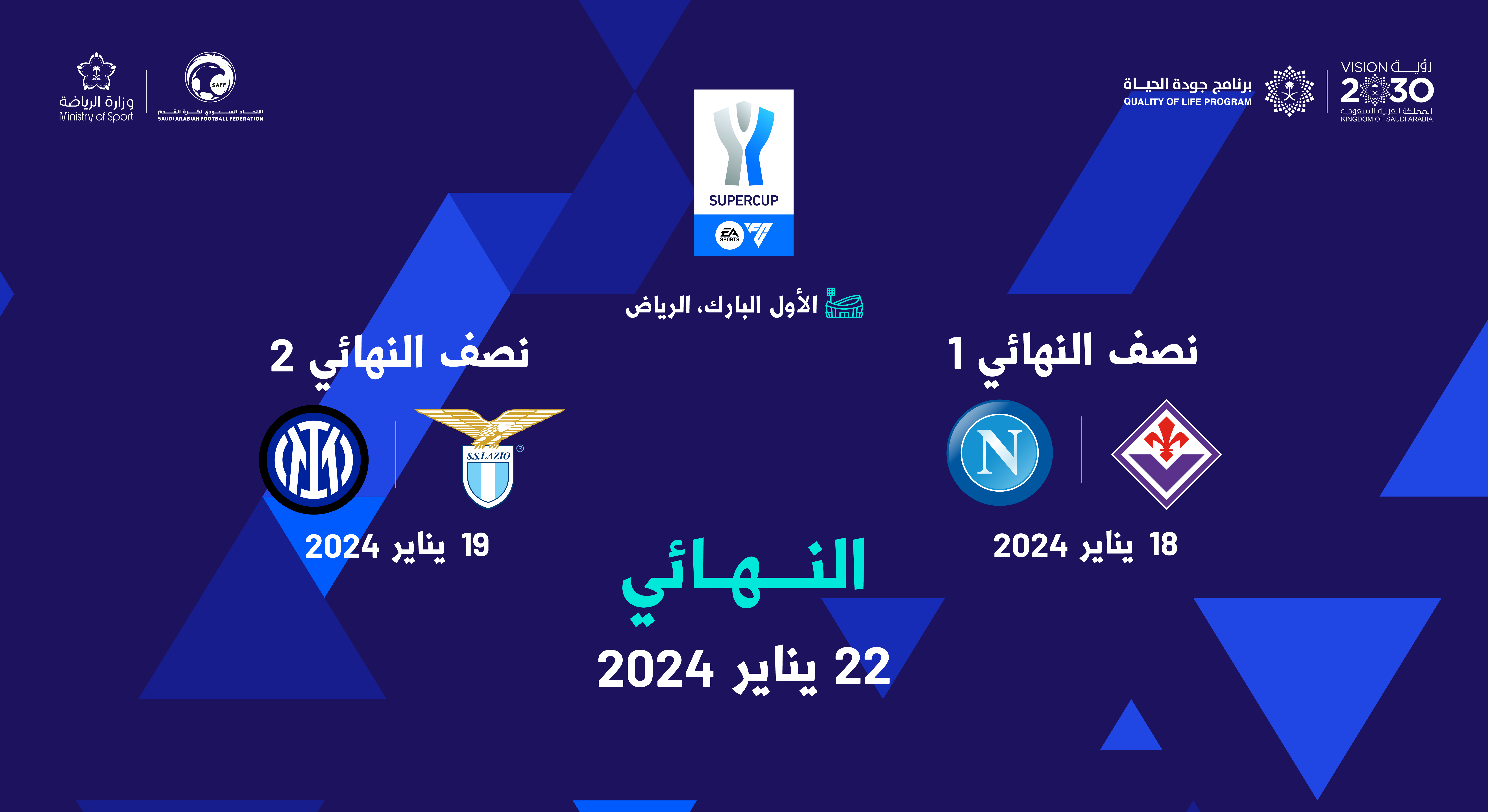 ويحتضن ملعب “الأول بارك” بمدينة الرياض، مواجهات البطولة التي ستقام بنظام خروج المغلوب؛ حيث يلتقي في المواجهة الأولى فريقا نابولي وفيورنتينا، مساء يوم الخميس 18 يناير 2024م، على أن يواجه فريق إنتر ميلان “حامل لقب النسخة الماضية”، نظيره لاتسيو يوم الجمعة الموافق 19 يناير، ويتأهل الفائزان للمباراة النهائية التي ستقام مساء يوم الاثنين 22 يناير المقبل.
