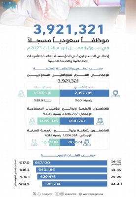 كشفت الإحصاءات السجلية لنظامي المؤسسة العامة للتأمينات الاجتماعية والخدمة المدنية أن الإجمالي العام للموظفين السعوديين (ذكوراً وإناثاً) المسجلين في سوق العمل السعودي بلغ 3,921,321 موظفاً بنهاية الربع الثالث لعام 2023 حيث شكل الموظفون (الذكور) ما نسبته 60.1% من الإجمالي العام بعدد بلغ 2,357,785 موظفاً في حين كانت نسبة (الإناث) من الإجمالي العام 39.9% وبعدد بلغ 1,563,536 موظفة وشكل العاملون السعوديون (الذكور والإناث) الخاضعون لنظام ولوائح التأمينات الاجتماعية النسبة الأعلى بـ 68.8% من الإجمالي العام وبعدد بلغ 2,696,797 موظفاً وقد سجل عدد (الذكور) 1,641,761 موظفاً وسجل عدد (الإناث) 1,055,036 موظفة ووفقاً للإحصاءات بلغ عدد السعوديين العاملين (الذكور والإناث) وفق نظام ولوائح الخدمة المدنية 1,224,524 موظفاً وبنسبة شكلت 31.2% من الإجمالي العام بلغ عدد (الذكور) فيها 716,024 موظفاً فيما بلغ عدد (الإناث) 508,500 موظفة وأظهرت البيانات بحسب الفئات العمرية أن الفئة العمرية للموظفين السعوديين ما بين (30 – 43) هي الأعلى من بين الفئات العمرية الأخرى وبعدد بلغ 667,100 موظف شكلت ما نسبته 17% من الإجمالي العام للموظفين (الذكور والإناث) تلاها الفئة العمرية (35 – 39) وبعدد بلغ 640,496 موظفاً وبنسبة بلغت 16.3% ثم الفئة العمرية ما بين (25 – 29) وبعدد بلغ 629,475 موظفاً وبنسبة بلغت 16% ثم الفئة العمرية ما بين (40 – 44) وبعدد بلغ 585,734 موظفاً وبنسبة بلغت 14.9% .