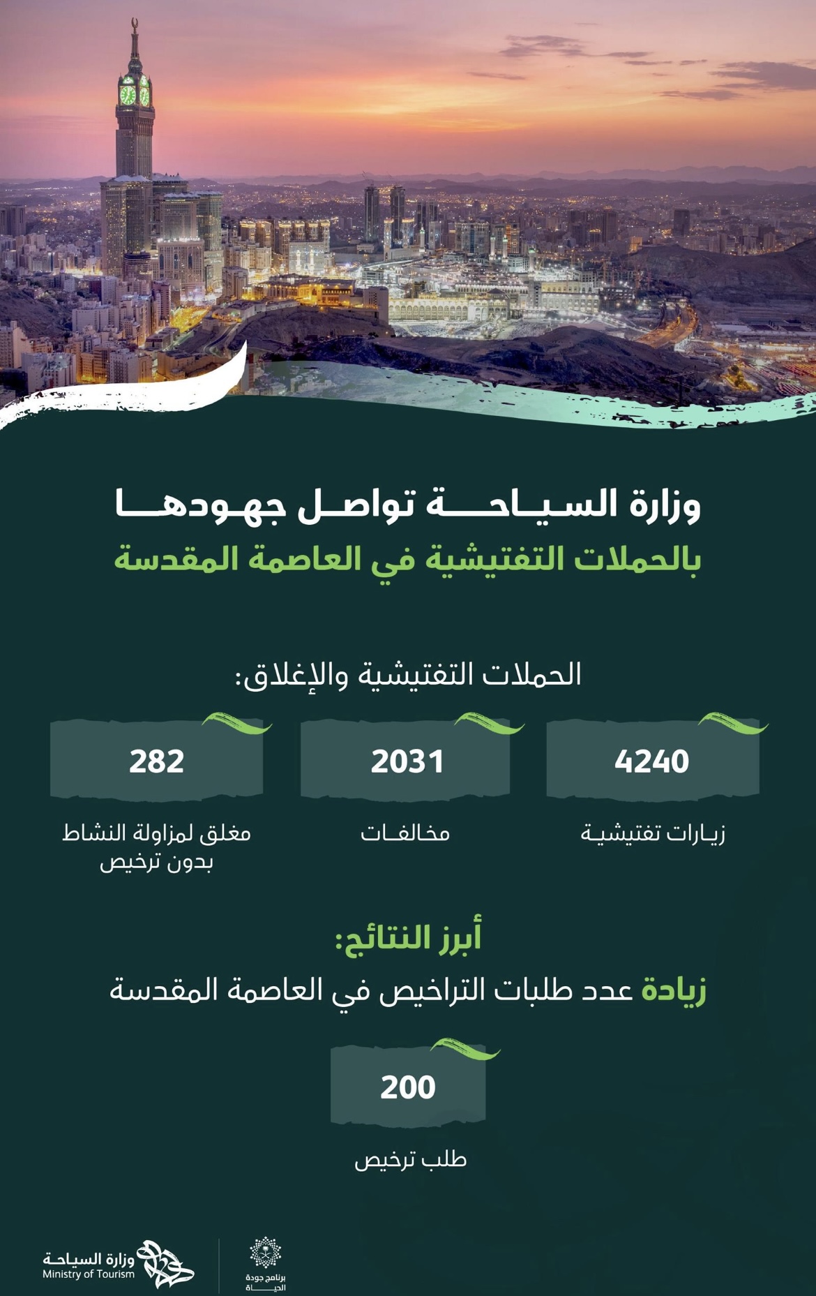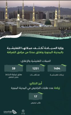 نفذت وزارة السياحة أكثر من 4000 جولة تفتيشية على مرافق الضيافة السياحية في مكة المكرمة تحت شعار ” ضيوفنا أولوية ” ورصد أكثر من 2000 مخالفة وذلك بهدف التنفيذ الفعلي لعقوبة الإغلاق بحق مرافق الضيافة السياحية المخالفة بمزاولة النشاط قبل الحصول على الرخص اللازمة للتشغيل وأغلقت الوزارة أكثر من 280 مرفق ضيافة سياحياً مخالفاً وذلك لحين تصحيح أوضاعها وإصدار الرخص النظامية من وزارة السياحة إذ وصل عدد طلبات التراخيص في مكة المكرمة 200 طلب كما نفذت الوزارة أكثر من 1400 جولة تفتيشية على مرافق الضيافة السياحية في المدينة المنورة ورصدت أكثر من 1200 مخالفة ونتج عن هذه الجولات إغلاق أكثر من 50 مرفق ضيافة سياحياً مخالفا وذلك لحين تصحيح الأوضاع وإصدار الرخص النظامية من الوزارة إذ وصل عدد طلبات التراخيص في المدينة المنورة ما يزيد على 15 طلباً وتؤكد الوزارة على جميع مقدمي الخدمات السياحية ضرورة الالتزام بالأنظمة والمعايير المتعلقة بتقديم الخدمات مع الحرص على تقديمها بالجودة التي تحقق رضى وراحة الزوار كما نوهت بإمكانية تقديم الاستفسارات أو الشكاوى المباشرة من خلال مركز العناية بالزائر 930 ، يذكر أن الوزارة تواصل حملاتها التفتيشية تحت شعار ضيوفنا أولوية التي تهدف إلى تنظيم وتطوير القطاع ورفع جودة الخدمات المقدمة بالإضافة إلى تحسين تجربة الزائر والتأكد من سلامتهم والعمل على تهيئة بيئة استثمارية جاذبة .