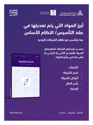 دعت وزارة التجارة الشركات القائمة التي تم تأسيسها “قبل سريان نظام الشركات الجديد في 19 يناير 2023م” إلى المبادرة بتعديل عقد التأسيس بما يتناسب مع نظام الشركات الجديد عبر (منصة الأعمال) التابعة للمركز السعودي للأعمال الاقتصادية وأوضحت الوزارة أن تعديل عقد تأسيس الشركات يأتي وفقاً للمرسوم الملكي رقم (م/132) وتاريخ 1/ 12/ 1443هـ القاضي بقيام جميع الشركات القائمة عند نفاذ نظام الشركات (19 يناير 2023م) بتعديل أوضاعها وفقاً لأحكامه وحثت الوزارة الشركات لزيارة “منصة الأعمال”: business.sa والدخول على خدمة “تعديل عقد التأسيس/ النظام الأساس” واختيار سبب التعديل “مواءمة” وتقديم الطلب إلكترونياً لتتم الاستفادة من (عدم وجود مقابل مالي لرسوم النشر) في الوقت الراهن ولتتمكن الشركات من الاستفادة القصوى من الخدمات الإلكترونية المقدمة للشركات من جميع الجهات الحكومية وتتمثل أبرز مزايا تعديل عقد التأسيس في: إمكانية استفادة الشركة الصغيرة ومتناهية الصغر التي تنطبق عليها المعايير من متطلب الإعفاء من تعيين مراجع الحسابات وفقاً للنظام وإمكانية التحقق من بيانات عقد التأسيس / النظام الأساس إلكترونياً من قبل القطاعين العام والخاص وإمكانية قيام الشركة بتعديل كافة مواد عقد التأسيس / النظام الأساس الحالي بطلب تعديل عقد التأسيس كما يُمكن للشركات ذات العقود اليدوية والإلكترونية والشركات الصادرة بترخيص من وزارة الاستثمار تعديل عقد التأسيس وأوضحت الوزارة أن طلب تعديل عقد التأسيس يتم تقديمه من قبل: (الشريك / المدير / المفوض) ويشترط وجود قرار جمعية عمومية غير عادية للشركات المساهمة والمساهمة المبسطة ويتم تقديم الطلب للسجلات الرئيسية للشركات فقط وبينت أنه لا يمكن تقديم طلب تعديل عقد التأسيس في الحالات التالية: وجود طلبات تجديد أو تعديل للسجل التجاري قائمة وتحت المعالجة ، وجود طلب تعديل عقد تأسيس قائم لنفس الشركة وعندما تكون حالة السجل التجاري للشركة منتهي وفيما يتعلق بأبرز المواد التي يتم تعديلها في عقد التأسيس / النظام الأساس تكون بحسب نوع كيان الشركة وتخضع بعض المواد للتعديل الكلي أو الجزئي أو تبقى كما هي وأبرز المواد هي: الشركاء ، اسم الشركة ، أغراض الشركة ،  رأس المال ، إدارة الشركة .