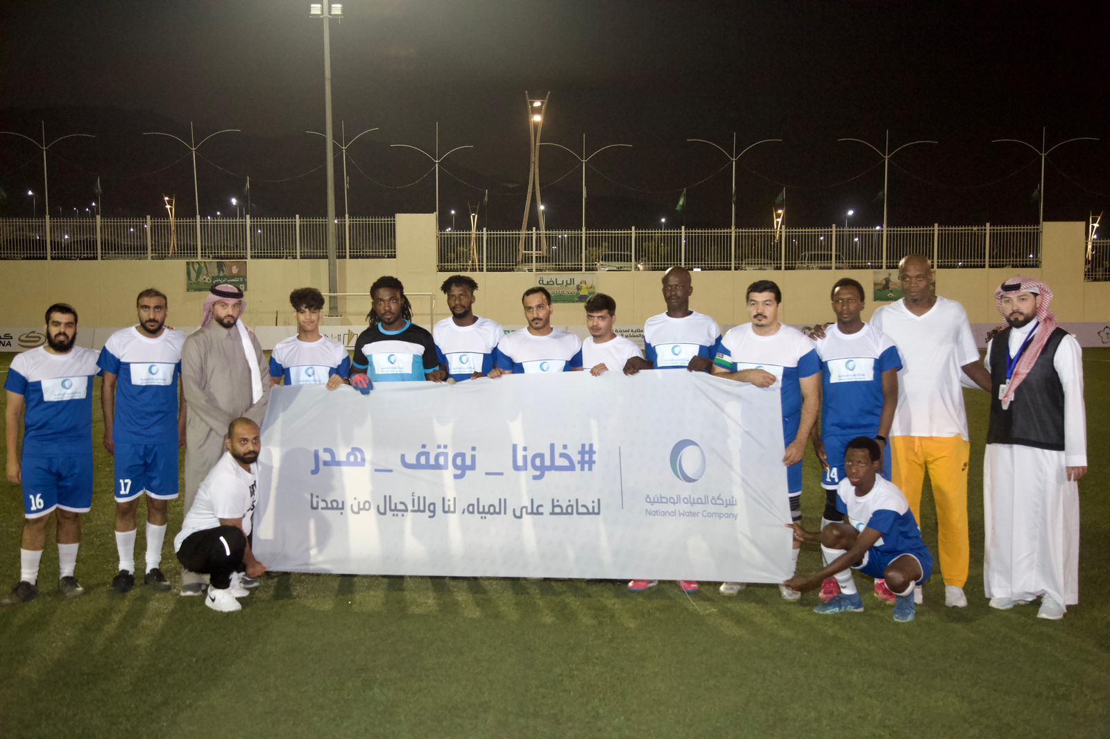 في لفتة مجتمعية جميلة خطفت شركة المياه الوطنية الأنظار خلال مشاركتها الكروية الأولى في بطولة نادي الوحدة للجهات الحكومية والقطاع الخاص بعد ان رفع الفريق المشارك لافتة تحمل في طياتها احدى رسائل الشركة ( خلونا نوقف هدر ) والتي تهدف الى توعية المجتمع لضرورة المحافظة على المياه للحاضر والمستقبل وتعتبر هذه الرسالة واحدة ضمن العديد من الرسائل التوعوية التي تطلقها الشركة بشكل مستمر لتوعية المجتمع من أجل المحافظة على ترشيد استهلاك المياه وكانت بطولة نادي الوحدة للجهات الحكومية والقطاع الخاص قد انطلقت مؤخراً في مكة المكرمة بمشاركة 32 فريقاً يمثلون الجهات الحكومية المدنية والعسكرية الى جانب مشاركة القطاع الخاص وتهدف البطولة الى التشجيع لممارسة الرياضة وتحسين جودة الحياة برعاية الهيئة الملكية لمدينة مكة المكرمة والمشاعر المقدسة وشركة كدانة .