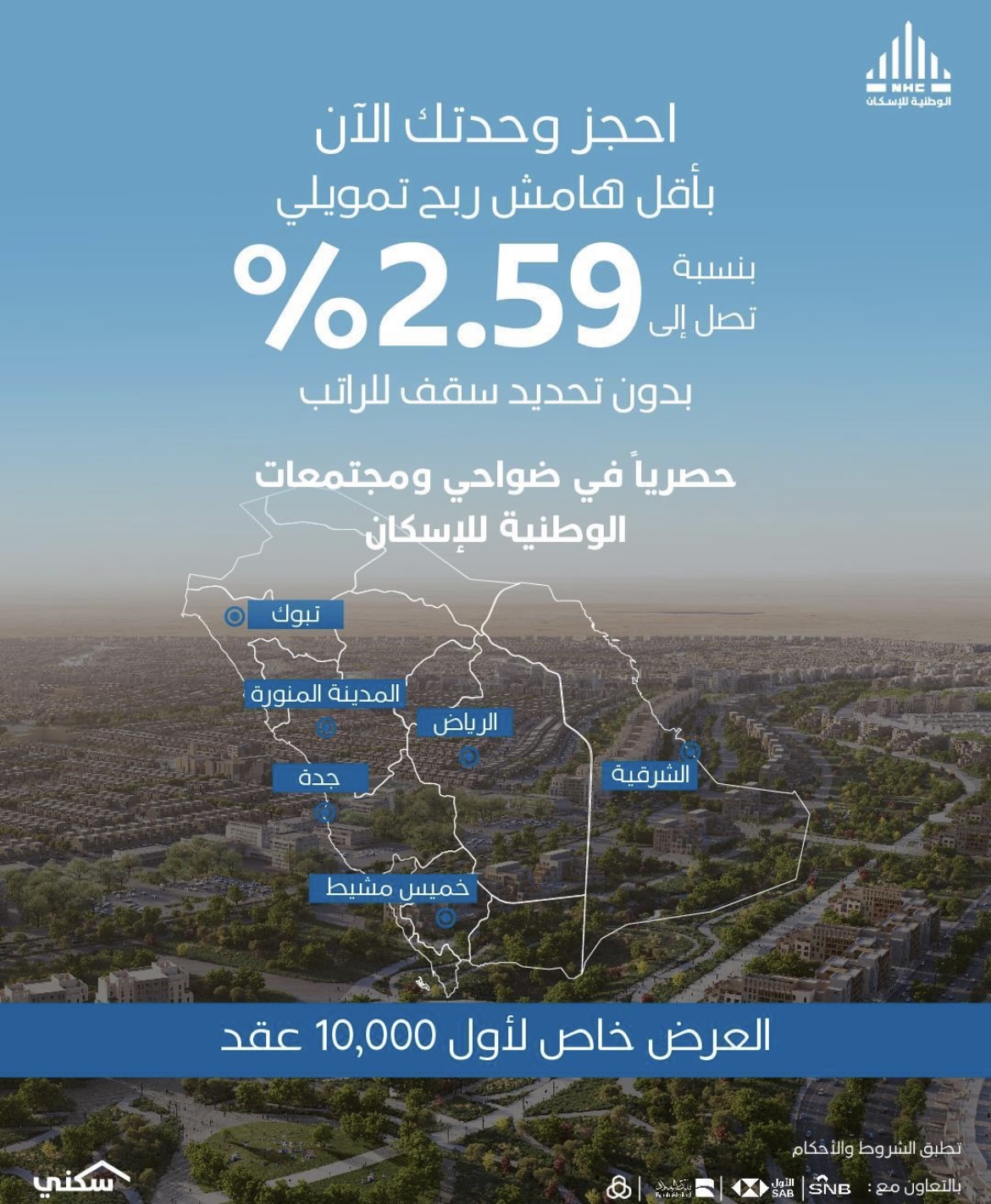 أعلنت الوطنية للإسكان NHC تطبيق نسبة التمويل المخفضة “أقل هامش ربح تمويلي” المقدم من صندوق التنمية العقارية على جميع المشاريع السكنية التي تعمل على تطويرها في الضواحي والمجتمعات العمرانية بنسبة تصل لـ 2.59% بدون تحديد سقف رواتب لأول 10 آلاف عقد بيع على الخارطة مع 4 بنوك محلية وأشارت إلى بدء تنفيذ عقود التمويل مع أربع بنوك محلية هي مصرف الراجحي البنك الأهلي السعودي وبنك البلاد والبنك الأول ودعت الراغبين في الشراء في الضواحي والمجتمعات العمرانية إلى استكمال الإجراءات التعاقدية والاستفادة من العرض الذي يستهدف 10 آلاف مواطن بحسب أولوية الحجز وأشارت الوطنية للإسكان NHC إلى أنه وبالتنسيق مع صندوق التنمية العقارية ستبدأ الحجوزات من اليوم حيث يمكن التعرف على المشاريع من خلال زيارة مكاتب المبيعات في الضواحي والمجتمعات العمرانية أو منصة سكني الرقمية عبر الرابط: https://sakani.sa/mega-projects .