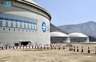 كما تعمل على تقليل استهلاك الوقود السائل بمقدار (4.2) ملايين برميل مكافئ يوميًا وخفض الانبعاثات الغازية لثاني أكسيد الكربون بمقدار ((2.3 مليون طن متري سنويًا بالإضافة إلى خفض التكاليف التشغيلية للإنتاج إلى أقل من (60) هللة للمتر المكعب إلى جانب تحقيق أرقام قياسية في كفاءة استهلاك الطاقة لإنتاج المتر المكعب بلغت (2.68) قبل احتساب الطاقة البديلة التي تجعل استهلاك الطاقة من الشبكة الكهربائية أقل من (2.42) كيلو وات للمتر المكعب وهو الأقل عالميًا في تكلفة استهلاك الطاقة وقام الوزير الفضلي بجولة ميدانية شملت المنظومة الابتكارية التجريبية لإنتاج أيونات المغنيسيوم والتي تعمل باستخدام تقنية النانو لفصل الأيونات الأحادية والثنائية بحيث يمكن تركيز نسبة المغنيسيوم والكالسيوم والمعادن المصاحبة في مياه محلول الرجيع الملحي ، كما تفقد معاليه نظام نقل كل من الشعيبة – قويزة (ب) والذي يهدف لزيادة موثوقية الضخ لمدينة جدة بـ (600) ألف متر مكعب من المياه يوميًا بإجمالي أطوال بلغت (117) كلم لتصل المياه إلى محطة خزانات جنوب جدة والتي تتكون من خزانين سعة كل واحد منهما (170) ألف متر مكعب مع إمكانية إضافة عدد (4) خزانات مستقبلية بذات السعة لتصبح الطاقة الاستيعابية الإجمالية (1,2) مليون متر مكعب بالإضافة إلى نظام نقل خزانات “المغمس” والذي يهدف إلى نقل كميات مياه تصل إلى (2.4) مليون متر مكعب من مصدرين هما: منظومات إنتاج تحلية الشعيبة ومنظومة إنتاج تحلية رابغ بواقع (1.2) مليون متر مكعب من كل مصدر ويتم خزنها في خزانات “المغمس” بعدد (8) خزانات تبلغ سعة كل خزان (170) ألف متر مكعب ليصل إجمالي سعة الخزن إلى (1.36) مليون متر مكعب ، إلى ذلك وقف معاليه على نظام نقل “عرفات – الطائف” الذي تبلغ سعة النقل التصميمية له (176) ألف متر مكعب يوميًا حيث تم إنشاؤه عبر حفر نفق خدمات عملاق يعد الأطول عالميًا بطول (12.5) كيلواً متراً وقُطر (8.4) أمتار تتخلله أنابيب نقل المياه للخزن الإستراتيجي في الطائف الذي يتكون من (9) خزانات بسعة (170) ألف متر مكعب لكل خزان وبطاقة استيعابية إجمالية تبلغ (1.530) مليون متر مكعب حيث تقوم بتغذية محافظة الطائف بالإضافة إلى منطقة الباحة .