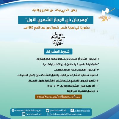 تنطلق في نهاية شهر شعبان المقبل، فعاليات “مهرجان ذي المجاز الشعري الأول”، الذي ينظمه نادي مكة الأدبي، قاصرًا المشاركة فيه على شعراء وشاعرات منطقة مكة المكرمة، بحيث يشارك كل احد منهم بقصيدة واحدة من إبداعه، شريطة أن تكون القصيدة باللغة العربية الفصحى، على أن ترسل المشاركات على الرابط (https://forms.gle/tvp4aqfzJXGxJ8fXA)، بحد أقصى 30 شعبان المقبل.