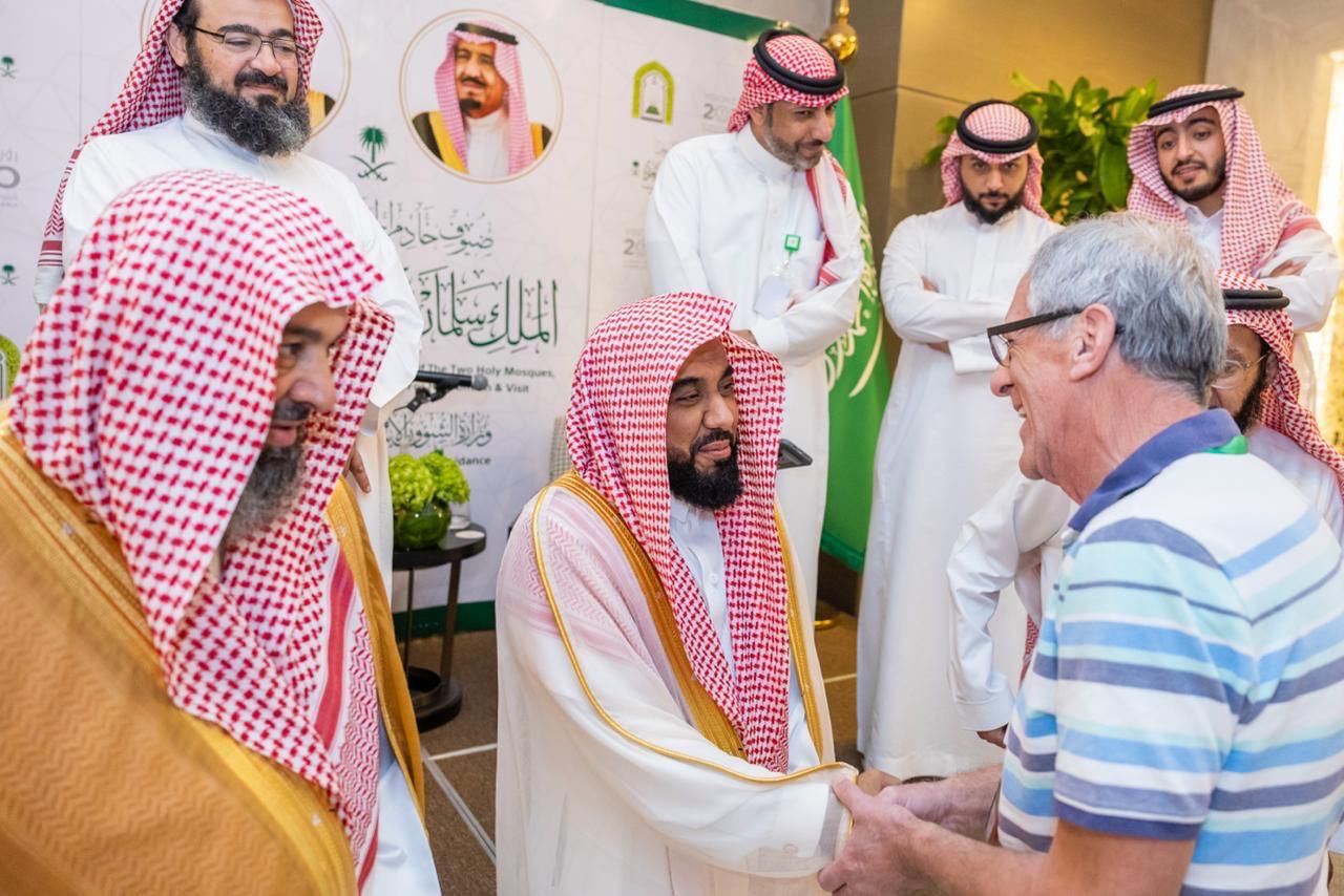 وكان في استقبال إمام وخطيب المسجد الحرام لدى وصوله إلى مقر إقامة الضيوف وكيل وزارة الشؤون الإسلامية والدعوة والإرشاد المكلف فضيلة الشيخ الدكتور عواد بن سبتي العنزي، ومسؤولو البرنامج .