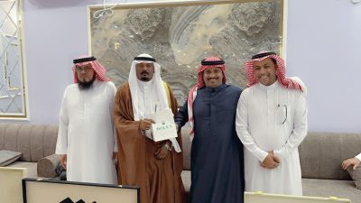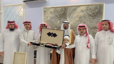 وقد قدمت له الهدايا التذكارية والدروع احتفاءاً به ، ومن ثم تناول الجميع طعام العشاء بعد أن احتفلوا بطريقتهم الخاصة من خلال شيلة عملت خصيصًا للمناسبة من كلمات الشاعر ماجد المالكي وأداء المنشد محمد العمري.