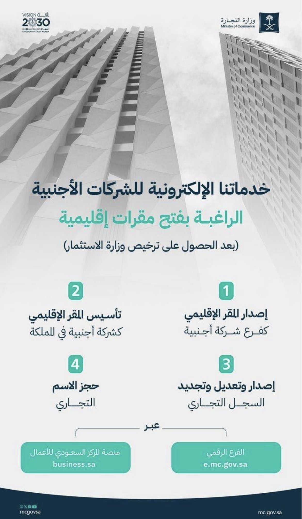 كشفت وزارة التجارة عن تقديمها لخدمات إلكترونية للشركات الأجنبية الراغبة بفتح مقر إقليمي بعد حصول على ترخيص من وزارة الاستثمار وبينت الوزارة أن هذه الخدمات هي: إصدار المقر الإقليمي بصفته فرع شركة أجنبية وتأسيس المقر الإقليمي بصفته شركة أجنبية وإصدار وتعديل وتجديد السجل التجاري وحجز الاسم التجاري وأوضحت التجارة أنه يمكن التقديم على هذه الخدمات إلكترونيًا عبر الفرع الرقمي على الرابط: e.mc.gov.sa وكذلك عبر منصة المركز السعودي للأعمال على الرابط: business.sa .