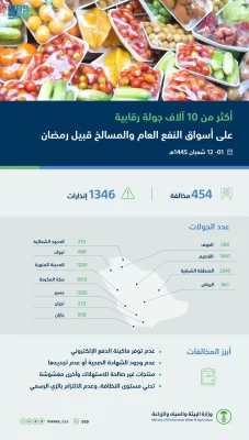 نفّذت وزارة البيئة والمياه والزراعة (10.102) جولة رقابية وتفتيشية على أسواق النفع العام والمسالخ؛ خلال الفترة من 1 – 12 من شهر شعبان الجاري؛ لرصد وفرة السلع والمنتجات الغذائية، والتأكد من التزام المنشآت بالأنظمة، واللوائح، والاشتراطات الصحية، والفنية وذلك قبيل أيام من بداية شهر رمضان الفضيل.