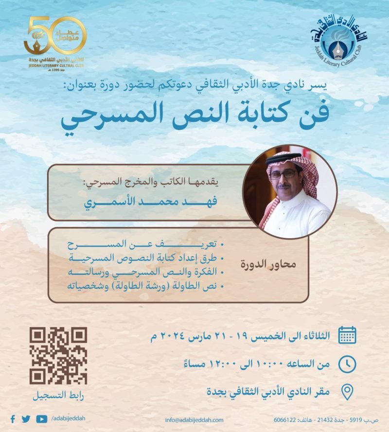 ينظم النادي الأدبي الثقافي بجدة، دورة تدريبية بعنوان: “فن كتابة النص المسرحي”، لمدة ثلاثة أيام، اعتبارا من الثلاثاء المقبل الموافق ١٩ مارس، وحتى الخميس ٢١ مارس.