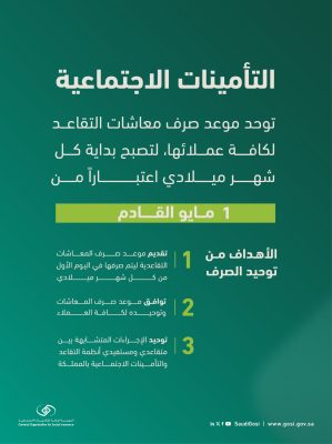 أعلنت المؤسسة العامة للتأمينات الاجتماعية عن توحيد موعد صرف المعاشات التقاعدية لكافة المتقاعدين والمستفيدين المشمولين بنظامي التقاعد المدني والعسكري ونظام التأمينات الاجتماعية وصرفها بداية كل شهر ميلادي اعتباراً من 1 مايو 2024م وبينت المؤسسة أن هذا الاجراء يأتي حرصاً منها على توافق موعد صرف المعاشات وتوحيده لكافة العملاء بما يضمن توحيد صرف المنافع التأمينية وتوحيد الإجراءات المتشابهة بين متقاعدي ومستفيدي أنظمة التقاعد والتأمينات الاجتماعية في المملكة كما يأتي تماشياً مع خطوات دمج العمليات والإجراءات التي أتت بعد قرار مجلس الوزراء رقم 657 وتاريخ 15/11/1442 الذي قضى بدمج المؤسسة العامة للتقاعد في المؤسسة العامة للتأمينات الاجتماعية وأوضحت التأمينات الاجتماعية أن هذا التعديل سيتم بموجبه صرف المعاشات لكافة العملاء في اليوم الأول من كل شهر ميلادي اعتباراً من التاريخ المشار إليه حيث سيتم صرف معاش شهر مايو في اليوم الأول منه ويستمر بعد ذلك صرف المعاشات في اليوم الأول من كل شهر ميلادي وأضافت المؤسسة أن صرف المعاشات في اليوم الأول من كل شهر ميلادي يعد صرفاً مقدماً لمعاش الشهر ذاته مقارنة بموعد الصرف السابق نهاية الشهر الميلادي وأكدت أنه حرصاً من المؤسسة على عدم تأثر أي من العملاء بهذا التعديل فسيكون صرف معاشات شهر أبريل لمتقاعدي ومستفيدي نظامي التقاعد المدني والعسكري في موعده في اليوم الخامس والعشرين من شهر أبريل على أن يصرف لهم معاش شهر مايو في اليوم الأول من شهر مايو وبذلك يتم توحيد موعد صرف المعاشات التقاعدية لكافة العملاء اعتباراً من 1 مايو 2024م ، يشار إلى أن التأمينات الاجتماعية في سعي مستمر لتحسين الإجراءات وتسريع العمليات وتقديم المنتجات والخدمات التي من شأنها تحقيق أحد أهدافها الاستراتيجية المتمثلة في تعزيز رضا العملاء وتقديم القيمة المضافة لهم .
