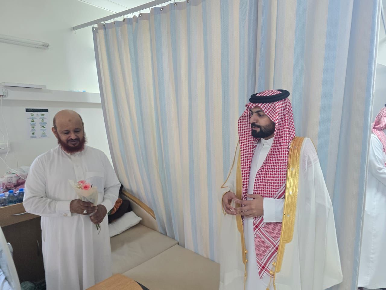 وعقب الصلاة قام محافظ المجاردة بزيارة للمرضى المنومين بمستشفى المجاردة العام وقد كان برفقته مدير القطاع الصحي بالمجاردة بالنيابة الأستاذ عبدالله علي الشهري وعدد من مدراء الإدارات الحكومية حيث قدم محافظ المجاردة للمرضى التهنئة والورود والهدايا بمناسبة عيد الفطر المبارك داعياً المولى عز وجل أن يلبسهم ثياب الصحة والعافية.