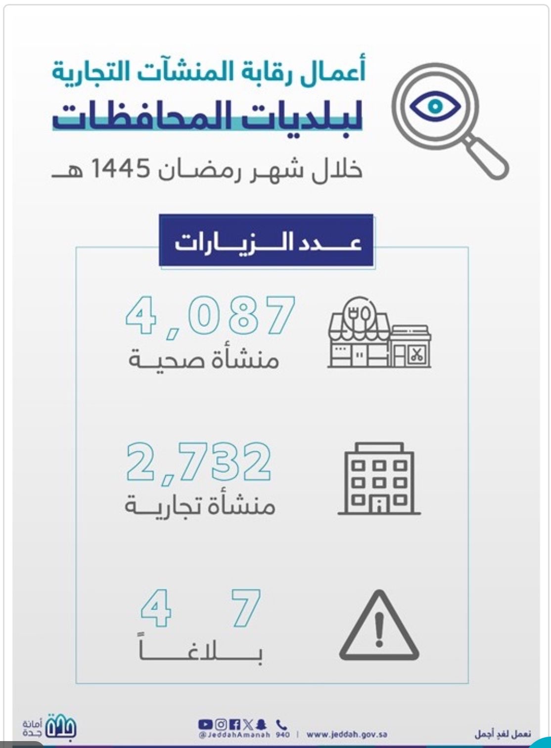 جدة : نفذت الفرق الرقابية في نطاق 15 بلدية محافظة تابعة لأمانة جدة خلال شهر رمضان الماضي أكثر من 6 الآف جولة رقابية، على المنشآت التجارية والصحية.