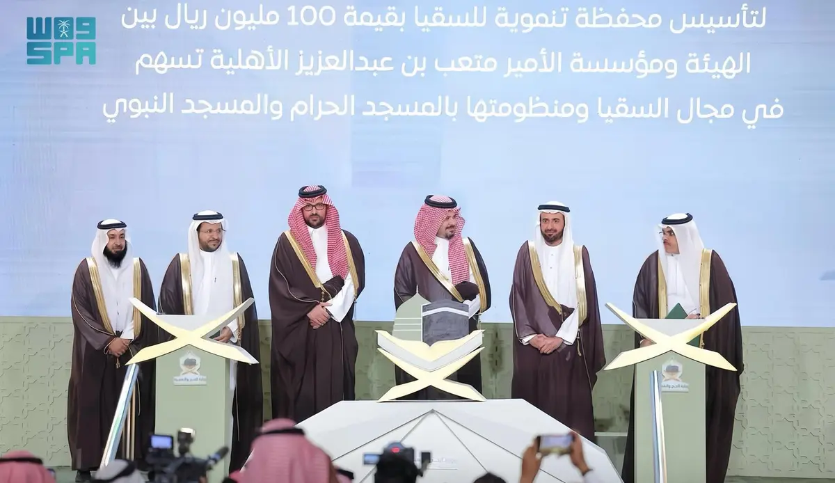 وقعت الهيئة العامة للعناية بشؤون المسجد الحرام والمسجد النبوي والهيئة العامة للأوقاف ومؤسسة الأمير متعب بن عبدالعزيز آل سعود الأهلية اليوم اتفاقية تأسيس محفظة مشاريع بمبلغ (100) مليون ريال لدعم وتطوير مجال السقيا في الحرمين الشريفين بحضور سمو أمير منطقة المدينة المنورة صاحب السمو الملكي الأمير سلمان بن سلطان بن عبدالعزيز آل سعود ومعالي وزير الحج والعمرة رئيس مجلس الهيئة العامة للعناية بشؤون المسجد الحرام والمسجد النبوي الدكتور توفيق بن فوزان الربيعة وذلك في حفل افتتاح منتدى العمرة والزيارة المقام بمركز الملك سلمان للمؤتمرات والمعارض في المدينة المنورة ووقع الاتفاقية الرئيس التنفيذي للهيئة العامة للعناية بشؤون المسجد الحرام والمسجد النبوي المهندس غازي بن ظافر الشهراني ومحافظ الهيئة العامة للأوقاف عماد بن صالح الخراشي والأمين العام لمؤسسة الأمير متعب بن عبدالعزيز آل سعود الأهلية الدكتور سالم بن علي آل خازم وتأتي الاتفاقية في إطار جهود تطوير البنى التحتية وتحسين الخدمات المقدمة للحجاج والزوار وتجسد التزام الجهات المعنية بتعزيز تجربة الحجاج والمعتمرين من المملكة .