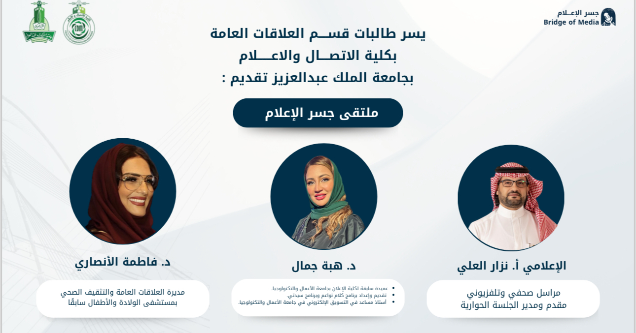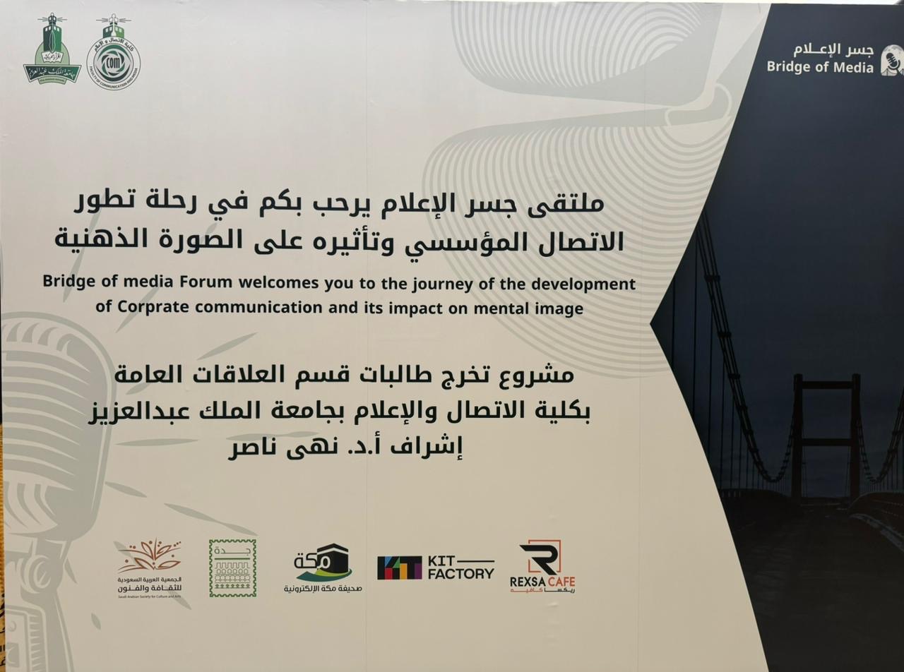 تنظم جامعة الملك عبدالعزيز، غدًا الإثنين 20 شوال الجاري، ملتقى جسر الإعلام،،الذي يناقش رحلة تطور الاتصال المؤسسي وتأثيره على الصورة الذهنية، ضمن مشروع تخرج طالبات قسم العلاقات العامة بكلية الاتصال والإعلام.